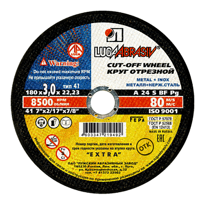 Круг отрезной 180х2,0х22мм А36 по металлу и нержавеющей стали 8500об/мин 80м/с Extra ЛУГА