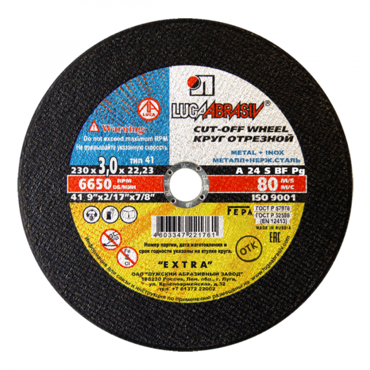 Круг отрезной 230х3х22мм А24 по металлу Extra ЛУГА