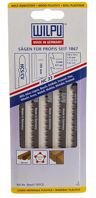 Полотно для лобзика по дереву и пластмассе HC 33 особо длинное до 65мм чистый рез (5шт) WILPU